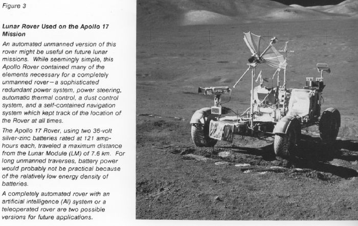 An orbital lunar mapper in the mid - to late 1990s has only small power requirements, which can be met by 1980s' technology. An unmanned surface explorer (compare (fig. 3) [Lunar Rover used on the Apollo 17 Mission] , beginning in 2004 would require only a few (2-5) kilowatts continuously, for movement, surface coring, analysis, and telemetry. A radioisotope generator (compare fig. 4) [a radioisotope thermoelectric generator] with dynamic conversion is the technology of choice.