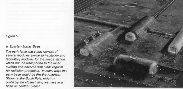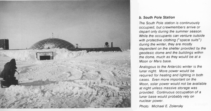 By 2010, a lunar camp , to be inhabited only during the 2 weeks of lunar day, wold initially require 25 kW, supplied by a solar photovoltaic system. this initial power level could be augmented during future visits using similar or improved photovoltaic technology. Or the lunar camp's power system could grow, in the same manner as that of the space station, to include solar dynamic or nuclear supplies. the initial power level is suitable for crew life support, lunar science, and light work, but it does not provide the storable energy for heat and life support during the lunar night. For full-time habitation, the camp and later the base would rely on nuclear power supplying a few hundred kilowatts. (See the analogy in figures 5a [Spartan Lunar Base] and 5b.) [South Pole Station] High power requirements away from the base for transportation or mining could be supplied by a separate source or by transmission. Point-to-point beamed transmission along the surface and space is possible.