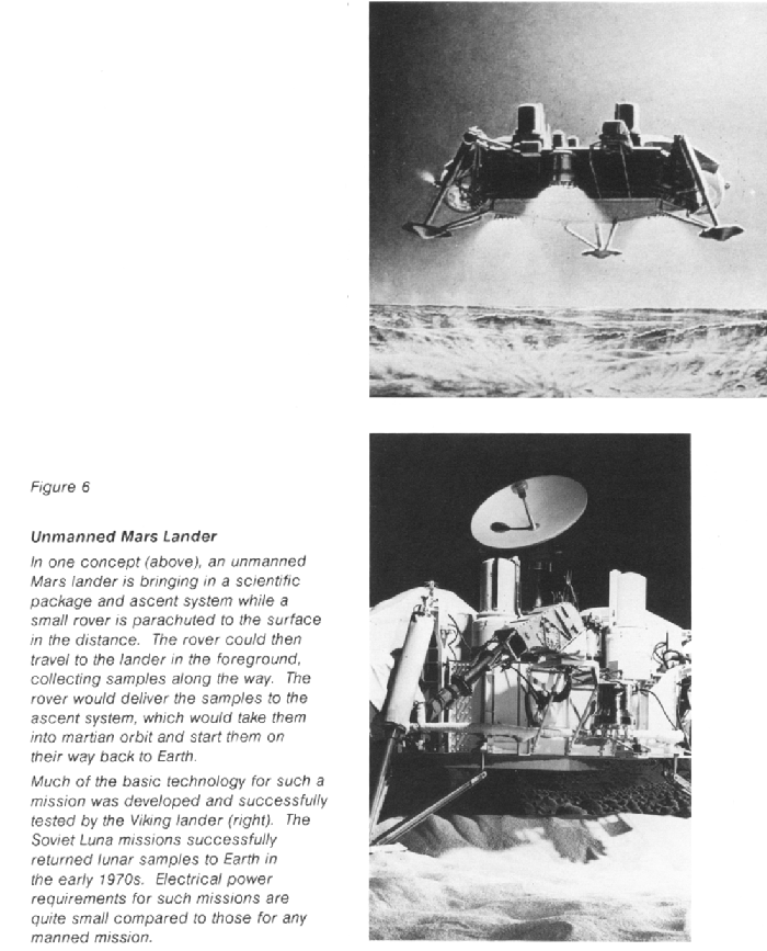 The baseline and alternative scenarios identify only one mission to Mars by 2010, the Mars sample return. This mission would require only very limited power, which could be provided by current technology - a radioisotope thermoelectric generator. the later Mars site survey rover would have power requirements similar to the lunar surface explorer (2-5kW) and, like it, would rely on a radioisotope generator with a dynamic converter. (See figure 6.) [Unmanned Mars Lander]