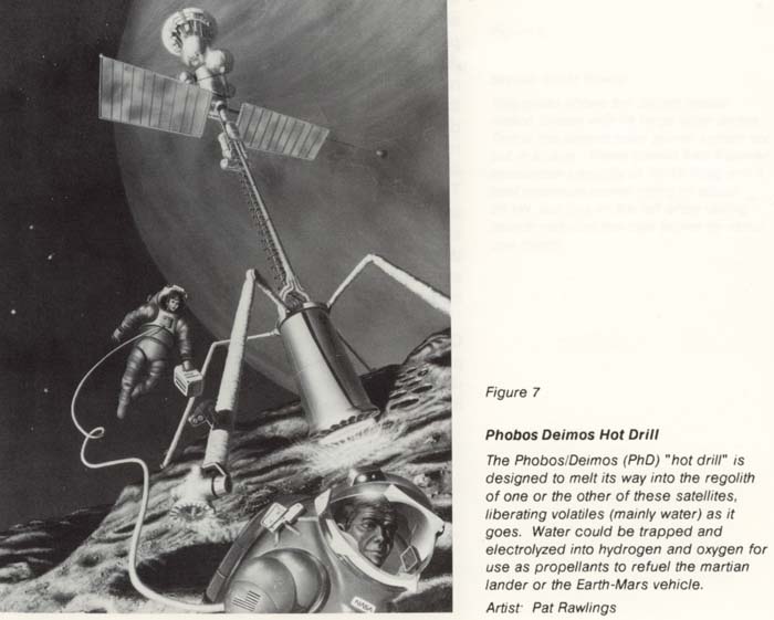 The alternative model (fig. 2) [a baseline scenario graph] includes unmanned exploration of an asteroid beginning in 2005. This involves activities and power requirements similar to those for the earlier lunar surface explorer and could be handled by a similar system. Mining (not included in the scenario) would require power on the order of 10 MW. A nuclear reactor power system developed for general application to industrial processing in space would be utilized. See figure 7 [Phobos Deimos Hot Drill] for a medium-range application on one of the asteroid-like moons of Mars.
