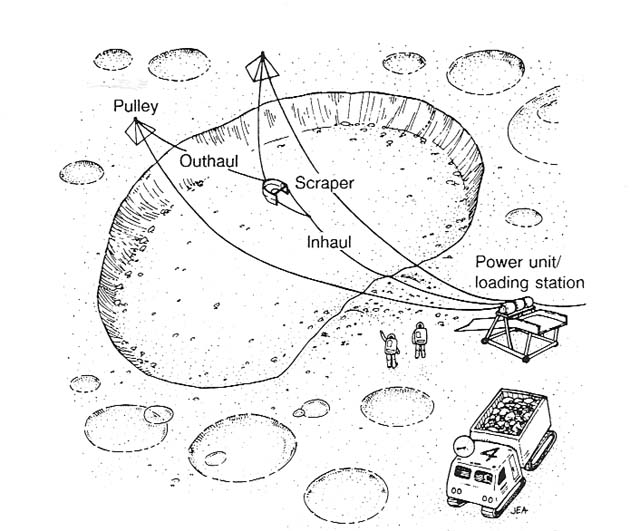 In this short paper, it is impossible to cover adequately all the alternatives and options, even within a well-defined system such as the slusher. However, I will mention one major alternative-a stationary power/loader unit (fig. 20), which is the terrestrial configuration. In this case, the slusher itself would be far simpler, but such a system would require an auxiliary vehicle to transport the slusher from site to site and set it up. A stationary slusher would be less able to remove unexpected obstacles from the pit, as I will discuss. Either way, the excavation duty ,cycle is basically the same.