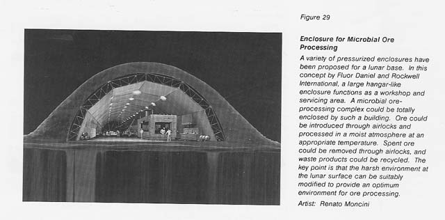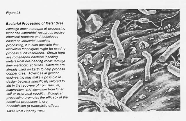 The question of harnessing bacteria for the beneficiation of ores on the Moon, on asteroids, or on Mars has been raised and must be seriously considered in the context of the utilization of space resources. Because of the almost total lack of organic matter on the Moon, it is fortunate that most bacteria known to participate in acid leaching of ores are autotrophic (derive all their carbon from carbon dioxide) as well as chemolithotrophic (derive energy through oxidation of reduced inorganic compounds or elements; e.g., hydrogen sulfide or ferrous ions). Furthermore, they satisfy all of their nutritional needs with inorganic substances, including certain trace elements known to be present in the Moon's regolith. But the development of biological processes to extract and purify ores on the Moon is severely constrained by the environmental conditions: the lack of elemental oxygen; the limited carbon, nitrogen, and hydrogen; the apparent lack of water; and the extremes of temperature and radiation. Thus, microbial ore processing must be established within a gas-tight enclosure. The enclosure must allow replenishment or augmentation of nutritional needs, retain moisture, maintain a suitable temperature, and protect the cells from radiation. See figure 29.
