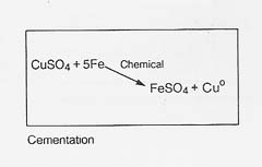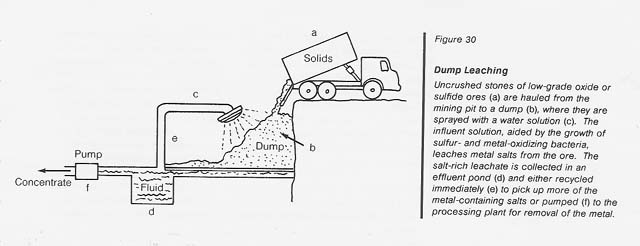 Dump leaching: This operation is usually applied to the extraction of copper from low-grade oxide or sulfide ores which are hauled as uncrushed stones from open-pit mines to enormous dumps (see fig. 30). The dumps are sprinkled with water and the percolate is collected in a natural or artificial catch basin. The copper is removed from the acidic leachate by cementation (with iron), electrolysis, or solvent extraction; the solution is then recycled through the dump. The operation continues for years during which time sulfur- and metal-oxidizing bacteria grow extensively to perpetuate the leaching process.