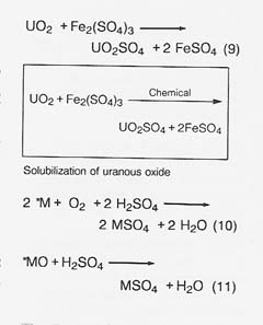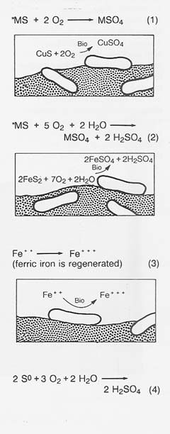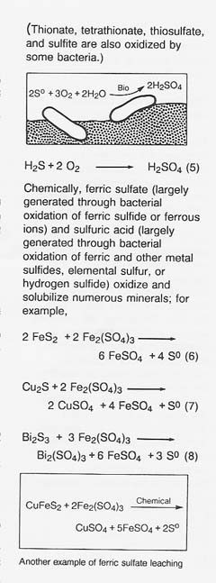 The chemistry of the process is complex and greatly affected by pH! oxidation-reduction potential, dissolved oxygen, and temperature. (Some of the authorities describing this chemistry are Hutchins et al. 1986; Kelly, Norris, and Brierley 1979; Lundgren, Valkova- Valchanova, and Reed 1986; Torma and Banhegyi 1984; and Torma 1987a.) For example, bacteria can catalyze and drive the following oxidations:
