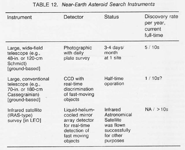 Table 12 lists the instruments that are being used or could be used to search for near-Earth asteroids. Currently, only a few near-Earth asteroids per year are being found. (See figure 6.) Table 13 lists techniques useful in characterizing asteroids and the types of information obtainable using these techniques. To be confident that usable materials could be recovered from asteroids, we need more specific characterization of their composition. A small commitment of resources (a few million dollars per year) to continue and modestly expand the efforts to find and characterize near-Earth asteroids would enable much greater progress to be made.