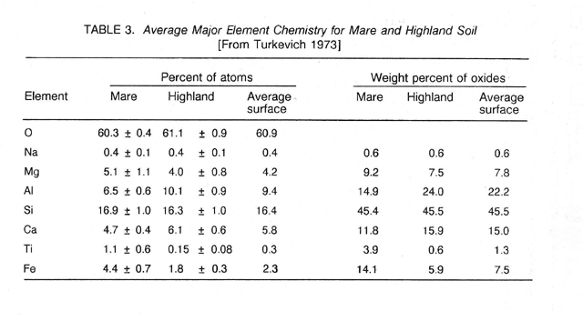 The chemistry of these two basic physiographic provinces is similar, except in aluminum, iron, calcium, and titanium (table 3), but their mineralogy is quite different. The highlands consist of rocks very rich in plagioclase and thus rich in aluminum and calcium; whereas, the maria consist of ilmenite- bearing basaltic rocks and thus are titanium- and iron-rich. The ideal early exploitation target would be situated where both types of materials are juxtaposed, such as near the margins of some mare (McKay and Williams 1979) or on a ray from a major impact that extends from the lunar highlands into a mare.