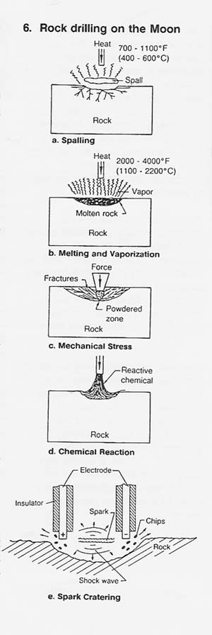 Different types of rock drilling are likely to be required on the Moon. Certainly core drilling will be desirable, if not essential, for collecting samples for rock characterization tests. But alternative, much less expensive hole-drilling techniques (in which the material from the hole is not kept intact) may be considered for such purposes as anchoring structures, explosive fragmentation, or even sample collection. All conventional rock drilling methods, including diamond coring, rotary drilling of soft rocks, and percussion drilling of hard rocks will be affected by differences between lunar and terrestrial operating conditions. Most obvious are differences in gravitational pull, atmospheric pressure, and thermal conditions. The very low gravitational forces on the Moon are likely to require a thrust system designed to assure adequate drilling progress. This could be a passive (weighting) system or an active Uacking) system. Regardless of which approach is taken, it seems very likely that drilling equipment will require significant modifications in order to provide the necessary thrust. The lack of atmosphere on the Moon will create complications in providing and maintaining drilling fluids. In conventional practice such fluids are needed, in considerable quantities, in order to remove cuttings from the hole and to cool the drill bit. And on the dry and highly fractured surface of the Moon, these fluids would be easily lost. Cooling of the bit, as well as of the drilling motor, may be further complicated by the thermal environment on the Moon. This will certainly be a complication during daytime operations on the surface. In sum, fundamental aspects of rock drilling are affected significantly. This impact will be reflected in needed changes to drilling equipment and operations. A first step in the investigation will be to determine as narrowly as possible the expected conditions under which drilling will have to be performed. This determination will in turn allow an identification of the basic parameters to be used in evaluating changes in fundamental drilling mechanics and hydraulics. Finally, such changes will lead to equipment modifications, if not to totally new drilling designs. While this discussion has centered nearly exclusively on conventional drilling technology, I should point out that extensive investigations have been made of numerous, radically different drilling technologies (e.g., Maurer 1980). A variety of reasons, including high conversion costs, institutional inertia, and the fact that most novel drilling methods require large amounts of energy, have so far prevented the widespread implementation of such alternative drilling methods. The novel drilling and rock excavation method that has found most widespread application-water jet excavation- is inappropriate for space applications. For reasons similar to those discussed under the next topic (rock melting), tradeoffs will need to be made between energy use (high for novel technology, low for conventional drilling) and delivery weight (low for novel technology, high for conventional drilling). |