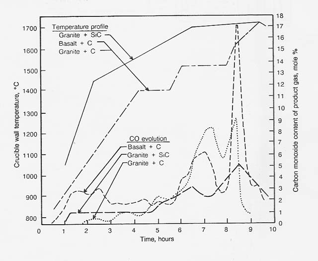 In the reaction of granite (50 g) with carbon (5 g), much less carbon monoxide was produced at low temperature. This result is due to the lower percentages of reducible oxides in the granite; that is, iron oxide (2.05% as Fe203), sodium oxide (3.10%), and potassium oxide (4.90%). Complete reduction of these oxides would consume 0.85 g (17%) of the carbon introduced. A total of 73 percent of the carbon introduced was recovered as carbon monoxide; therefore, we conclude that silicon dioxide reduction accounts for most of the carbon monoxide evolved at 1550�C and higher temperatures.