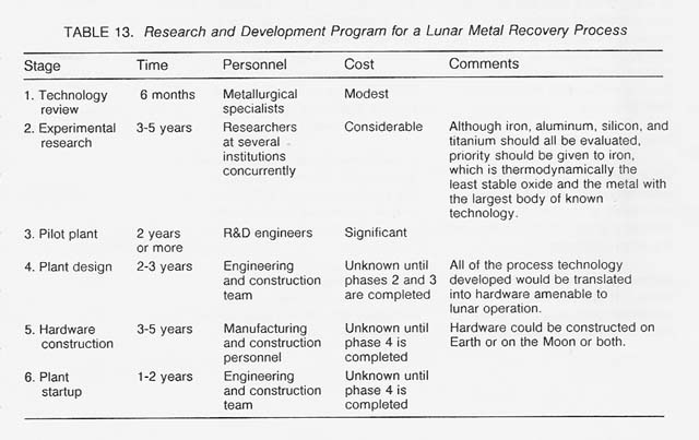Thus, if lunar resources are to be used in the early 21 st century, there is a clear need to begin a research and development program now. It should proceed through the stages presented in table 13.