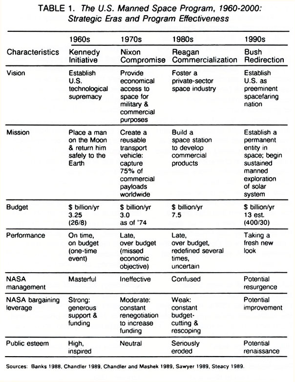 NASA has had at least three distinct directives since its inception in the 1960s, not counting the redirection under way since the Bush Administration took office (see table 1). This table shows the Proposed Strategic Eras and Program Effectiveness for the U.S. Manned Space Program from 1960-2000.) A brief review of these "strategic eras" demonstrates the impact of Presidential vision on the organization up to now and suggests parameters for the most effective vision statement for the 1990s and beyond.