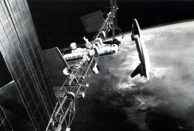 The directive to establish a permanently manned space station was a subsidiary mission in the Reagan era, subordinate to his vision of a Strategic Defense Initiative (SDI). However, to be worth $30 billion, the space station should really serve some worthwhile national purpose. Commercial applications have obviously been grossly overstated, As companies have backed off space manufacturing since solutions have already been developed on Earth. Furthermore, such a mission had been rejected in favor of the lunar mission by President Kennedy in 1961, a space station (Rendering of Space Station Freedom by Al Chinchar) not being considered bold enough for the 1960s (Del Guidice 1989) (although Skylab was built, flown, and manned three times in the 1970s).