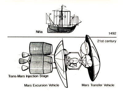Our Nina (and Pinta and Santa Maria) might look like this: A trans-Mars injection stage, essentially large propellant tanks with rocket motors attached (Columbus' ships didn't have to carry their propellant), to propel the ship from Earth to Mars. A Mars excursion vehicle, with Its aerobrake to slow the descent into Mars orbit (we, too, will make use of the "wind") and its martian lander. And a Mars transfer vehicle, also equipped with an aerobrake and much smaller rocket motors, to enter Mars orbit and bring the crew home.