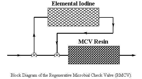 For the Space Shuttle program, a new device for the controlled release of I2 termed the Microbial Check Valve (MCV) was introduced. The MCV is a canister containing iodinated strong base ion exchange resin. In aqueous solution in the presence of excess iodide (I-), polyiodide anions are formed.