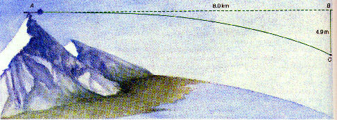 Any object with no force acting on it moves with constant velocity. This is known as Newton's First Law of motion. If a force acts on an object it would cause a change in velocity (acceleration) given by the mathematical relation: a = f/m where f is force and m is mass. This is called Newton's Second Law of motion. If you threw a ball straight forward, and there was no gravity or friction, the ball would continue on moving forward (Newton's First Law of Motion). However, on earth this does not happen because the air slows the ball due to friction and gravity pulls the ball to the center of the earth. The ball changes its vertical velocity by 9.8 meters per second per second due to the force of gravity. So if you throw a ball straight forward at first its vertical velocity is 0 meters per second. However, after one second the ball is falling towards the earth with a vertical velocity of 9.8 meters per second. After two seconds the ball has a vertical velocity of 19.6 meters per second towards earth. The faster you throw the ball the further the ball would go. What happens if you could throw the ball at a horizontal speed of 8000 meters per second with no air resistance. When the ball travels 8000 meters to point B, the earth has curved away from the ball by 4.9 meters. So even though the ball would still fall to earth continuously, because of the curvature of the earth the distance between the ball and the earth would remain constant. The ball would remain in orbit. The Space shuttle orbits the earth about 400 km above the surface of the earth. Both the space shuttle and the astronauts in it are constantly falling towards the earth. That is why the astronauts experience weightlessness.