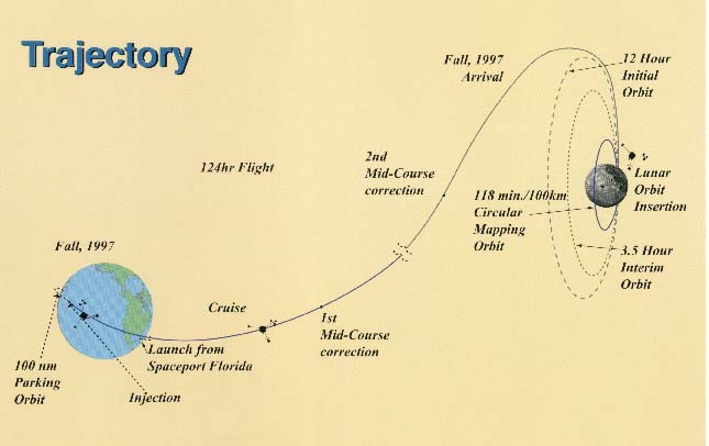 This NASA diagram shows Prospector's flight path to the Moon. The spacecraft circled the Earth before achieving injection over Australia. There was at least two mid-course corrections before reaching the Moon. Prospector was inserted into an initial large elliptical orbit around the Moon andwent through an interim orbit before achieving its final circular mapping orbit. This method of gradual orbit insertion assured the fuel efficiency vital to Prospector's low-cost design.