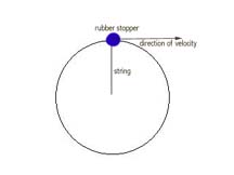The velocity is always perpendicular to the radius. The acceleration is due to the change of direction of velocity even though the speed of the rubber stopper is constant. The force is exerted by the fingers that are holding the string and transmitted to the rubber stopper through the string. The acceleration is called centripetal (center seeking) acceleration.